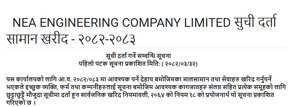 यस कार्यालयको लागि आ.व. २०८२/०८३ मा आवश्यक पर्ने देहाय बमोजिमका मालसामान तथा सेवाहरु खरिद गर्नुपर्ने भएकले इच्छुक व्यक्ति, फर्म तथा कम्पनीहरुलाई सूचना बमोजिम आवश्यक कागजातहरु संलग्न सहित प्रत्येक समूहको लागि छुट्टाछुट्टै मौजुदा सूचीमा दर्ता हुन सार्वजनिक खरिद नियमावली, २०६४ को नियम १८ को प्रयोजनार्थ यो सूचना प्रकाशित गरिएको छ ।